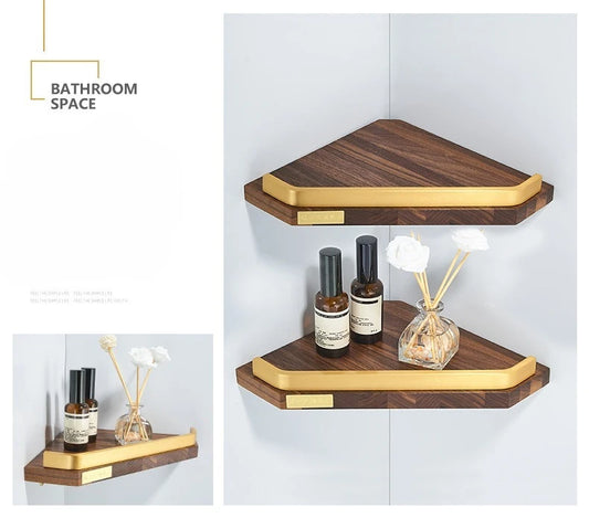 Accessoires de salle de bains en bois de noyer et or brossé