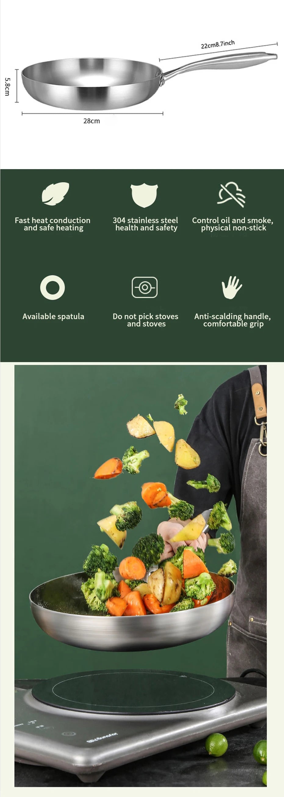 Matériau de Qualité : Fabriquée en acier inoxydable 304, cette poêle garantit une durabilité exceptionnelle et une performance antiadhésive optimale pour des cuissons saines.